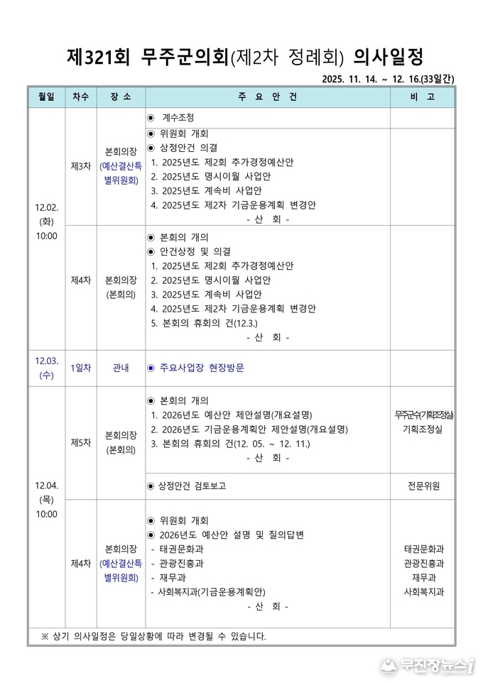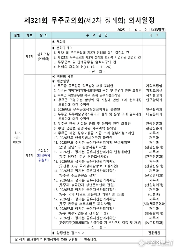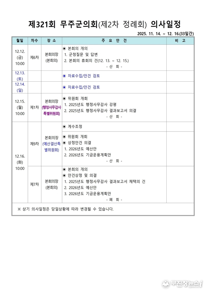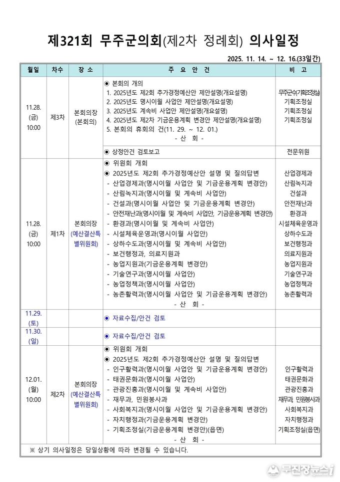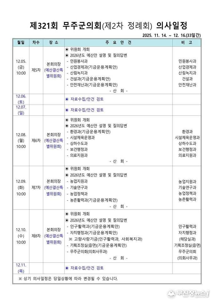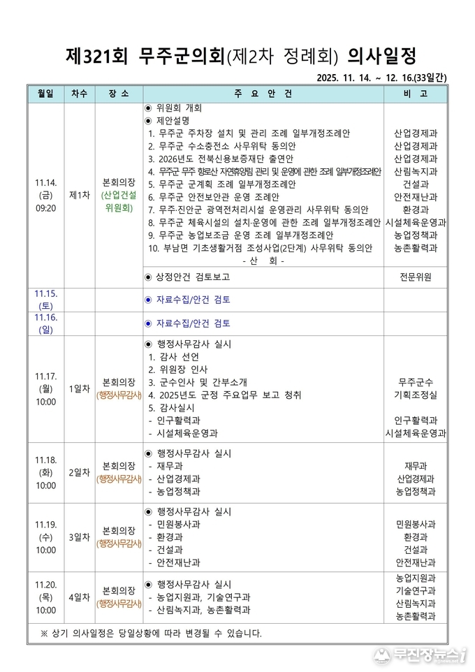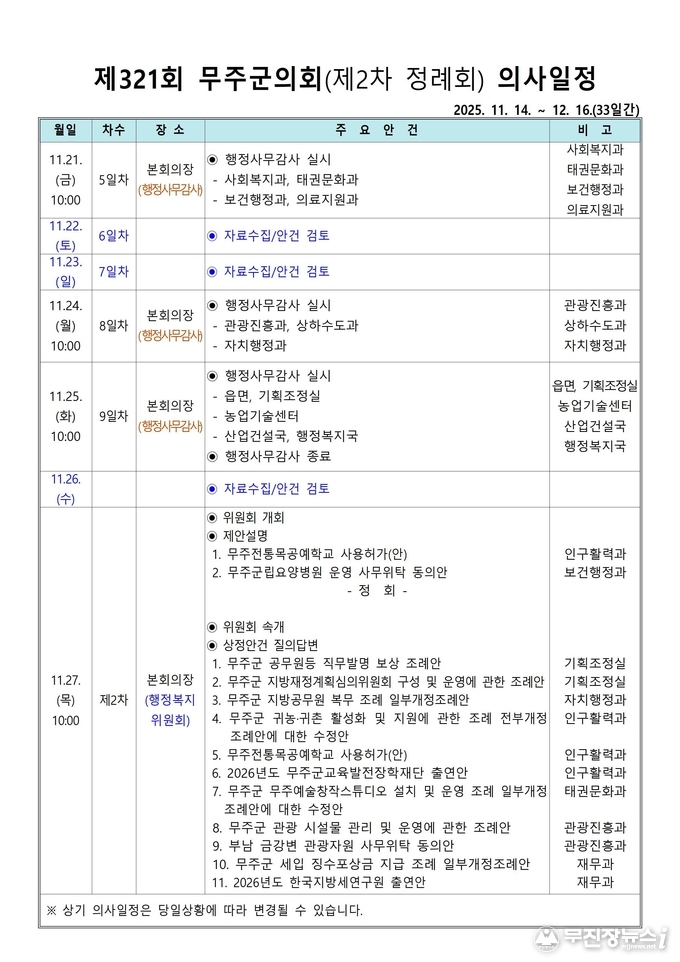 또한, 17일부터 25일까지는 각 실·과를 대상으로 행정사무감사를 실시하며, 28일부터는 2025년도 제2회 추가경정예산안 심의, 12월 4일부터 10일까지는 2026년도 본예산안 심의가 이어진다.