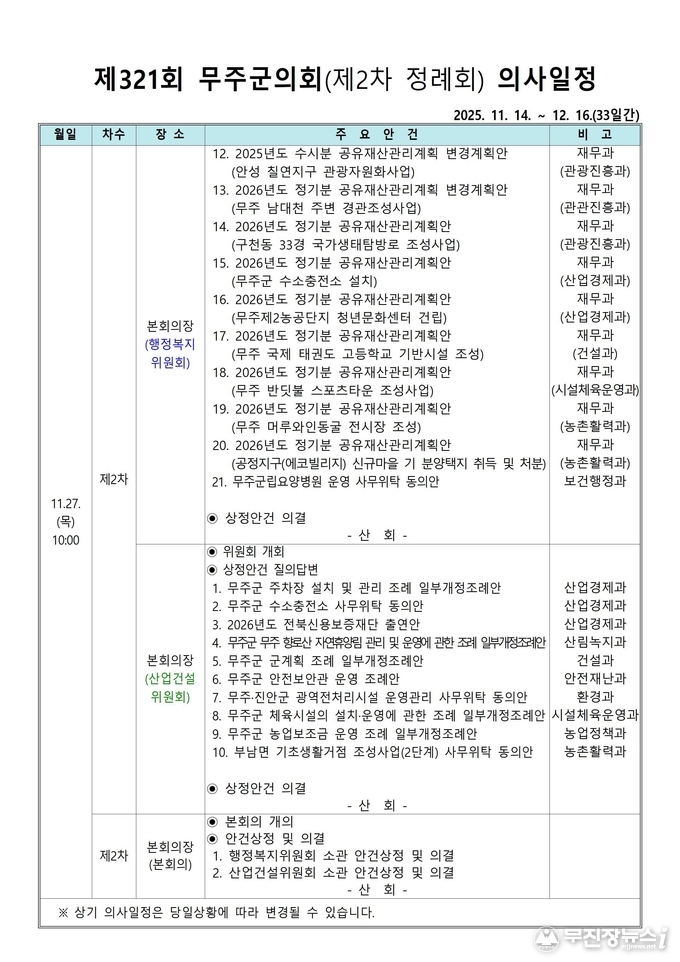 무주군의회(의장 오광석)는 11월 14일부터 12월 16일까지 33일간의 일정으로 제321회 제2차 정례회에 돌입했다.