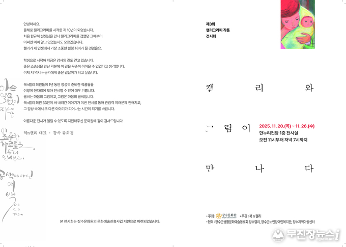이번 전시는 장수문화원이 주최하고 북n캘리가 주관했으며, 장수군생활문화예술동호회 장수캘리, 장수군노인장애인복지관, 장수지역아동센터가 협력해 진행된다.