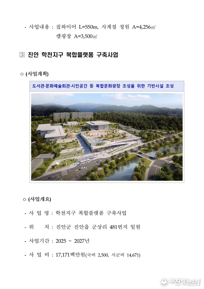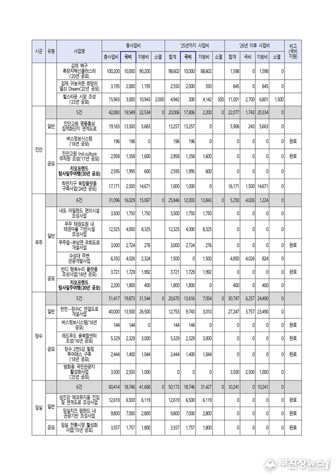 전체 54개 사업 중 '24년까지 4,044억원을 투입해 30개 사업을 완료하였으며, 올해에는 ‘진안 학천지구 복합플랫폼 구축사업’ 등 20개 사업에 사업비 384억을 투입하여 전체 사업의 80%를 완료한다는 계획이다.