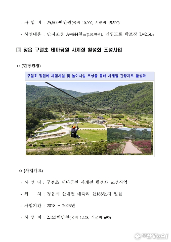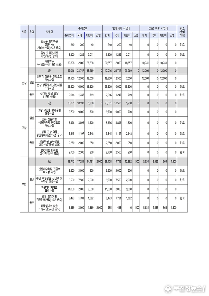 현재까지 추진된 대표적인 사업으로 ‘순창 장류밸리 기반시설 조성사업’은 단지 기반조성과 진입도로 조성을 통해 지역 전통의 특색을 살린 특화단지로 완성하였고, ‘정읍 구절초 테마공원 활성화 조성사업’의 경우 옥정호 구절초 정원을 기반으로 다양한 체험시설과 놀이시설 조성 등을 통해 사계절 관광지로 발돋음하는 계기를 만들었다. <참고4. / 13~15p>