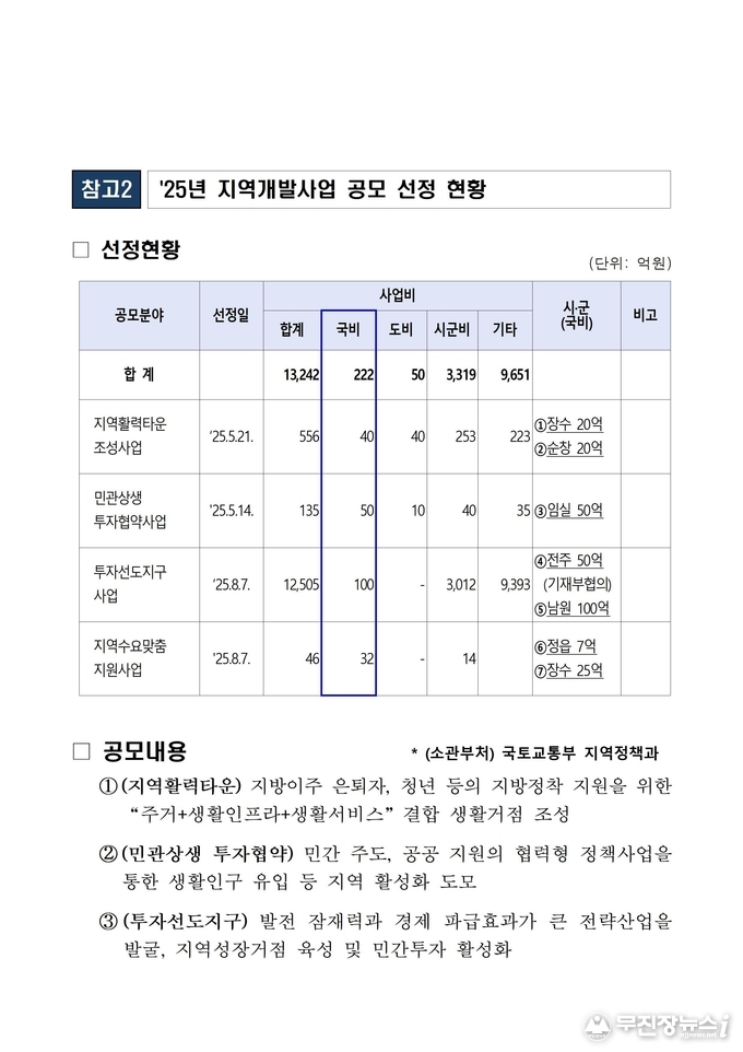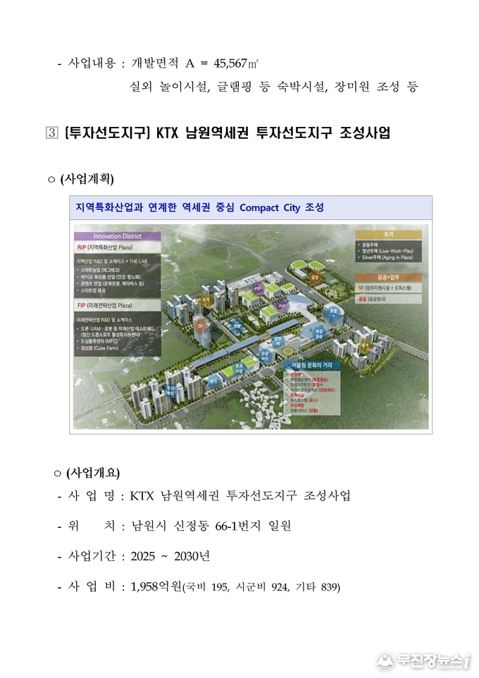 하반기 투자선도지구와 지역수요맞춤지원 공모에도 ‘KTX남원역세권 개발사업’, ‘장수 방화동 국민관광지 활성화’ 등 4개 사업이 선정, 국토부에서 주관한 공모사업 선정 명단에 전북은 모두 이름을 올렸다.