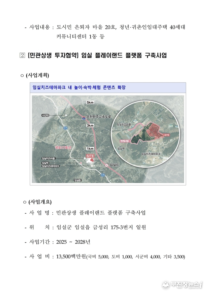 상반기에는 국토부·행안부·문체부 등 8개 부처가 공동 주관한 지역활력타운 공모에 장수와 순창이 선정되었고, 작년보다 선정규모가 대폭 감소되어 전국 5개소만 선정한 민관상생 투자협약 공모에도 치열한 경쟁을 뚫고 ‘임실 플레이랜드 플랫폼 구축사업’이 선정되었다.