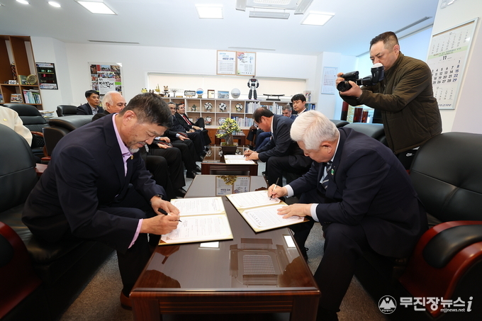 무주군은 21일 군수실에서 글로벌전통태권도연맹(총재 준리), 국제태권도사관학교설립추진위원회(위원장 정진옥)와 ‘태권도 문화 교류 및 협력을 위한 업무협약’을 체결했다.
