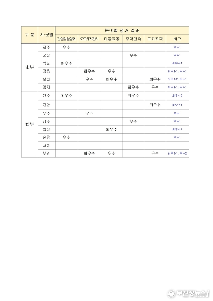 우수 기관으로는 ▲건설수주 활성화 전주시·순창군 ▲도로 유지관리 남원시·무주군 ▲대중교통 정책 정읍시·부안군 ▲주택·건축 시책 군산시·장수군 ▲토지·지적 관리 김제시·부안군이 이름을 올렸다.