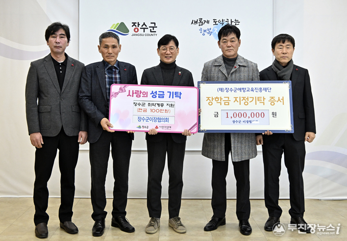 장수군 이장협의회(회장 송동훈)가 지역인재 양성과 이웃사랑 실천을 위해 장수군 애향교육진흥재단과 전북사회복지공동모금회에 장학금과 이웃돕기 성금 100만원을 각각 기탁했다고 22일 밝혔다.