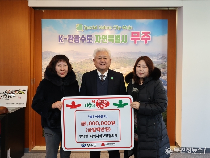 무주군 부남농촌지도자회 회원들이 지난 22일 부남면행정복지센터(면장 강명관)에 이웃돕기 성금 1백만 원을 기탁해 훈훈함을 전하고 있다.
