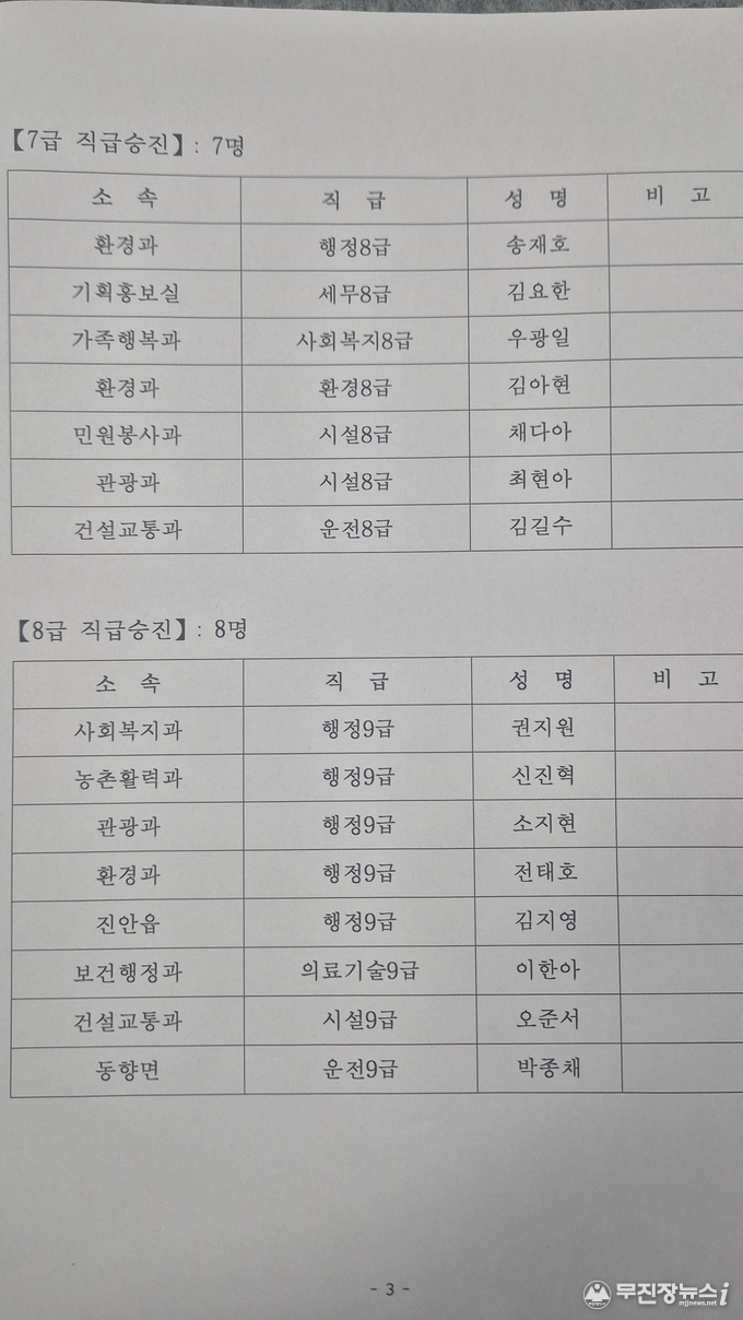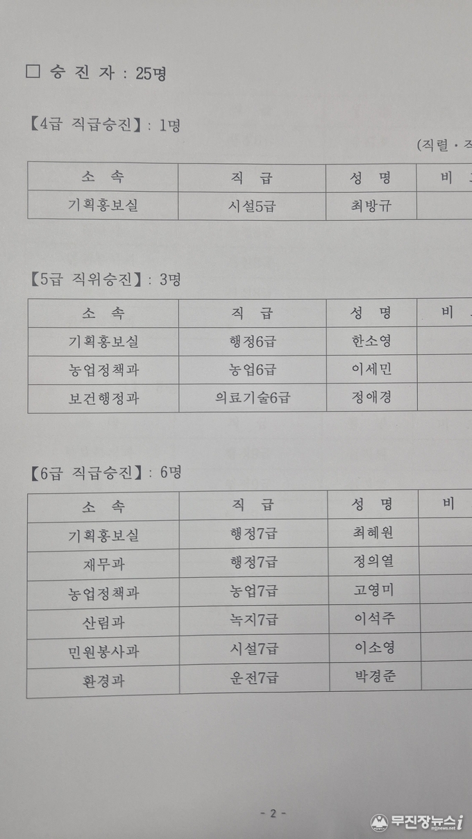 진안군, '26년 상반기 정기인사 승진 내정사항