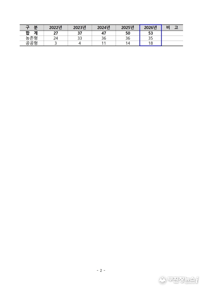 전년 대비 선정 비율도 크게 상승했다. 2025년에는 59개소가 신청해 50개소가 선정되며 85%의 선정률을 기록했으나, 2026년에는 54개소 신청에 53개소가 선정돼 98%에 달하는 성과를 거뒀다.