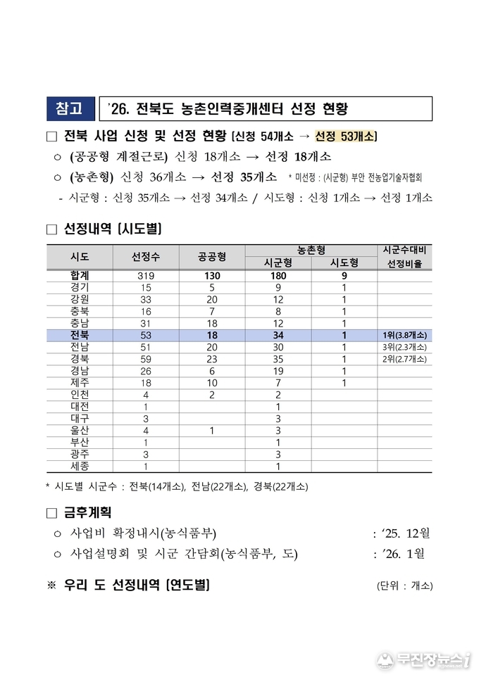 도는 이번 성과를 토대로 농촌인력중개센터 운영 내실화를 지속 추진하고, 공공형·농촌형 인력중개 모델을 한층 고도화해 ‘전북형 농촌인력 지원 정책’을 전국 선도 모델로 발전시켜 나갈 방침이다.