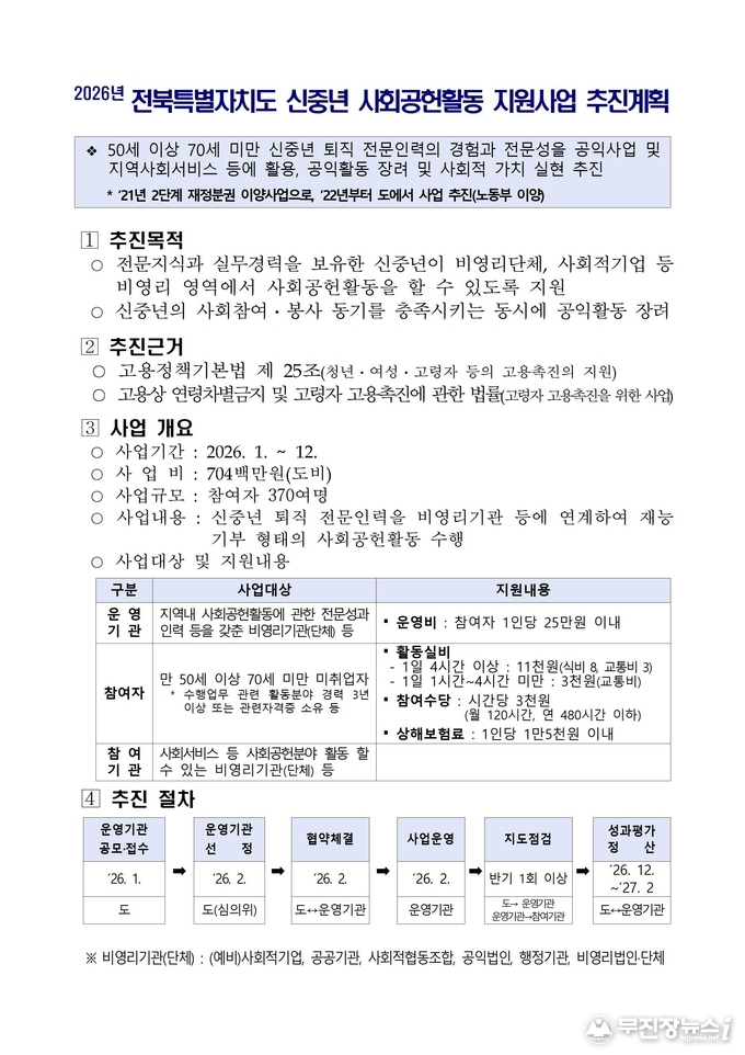 전북특별자치도는 만 50세 이상 70세 미만의 퇴직 신중년 전문인력을 대상으로, 풍부한 전문지식과 경험을 지역사회에 환원할 수 있도록 ‘2026년 신중년 사회공헌활동 지원사업’을 시행한다고 31일 밝혔다.
