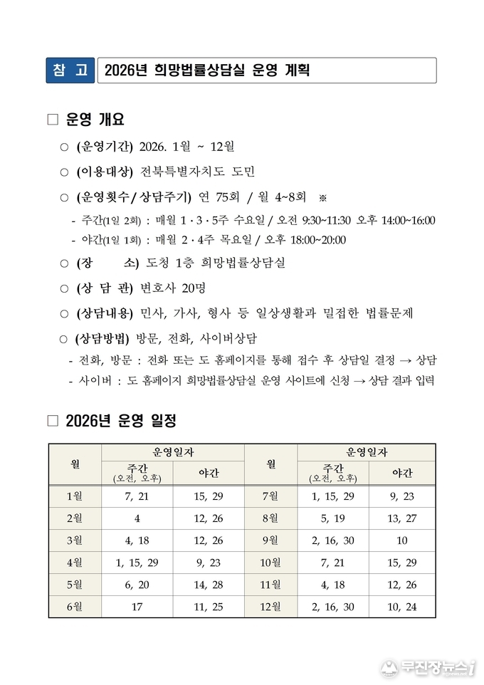 천영평 전북자치도 기획조정실장은 “법률과 세무 문제는 도민의 삶에 직결되는 중요한 사안인 만큼, 2026년에도 희망법률상담실을 중심으로 도민 권익 보호를 위한 지원을 지속 확대해 나가겠다”며, “도민이 체감할 수 있는 따뜻한 법률·행정 서비스를 통해 누구도 소외되지 않는 전북을 만들어 가겠다”고 말했다.