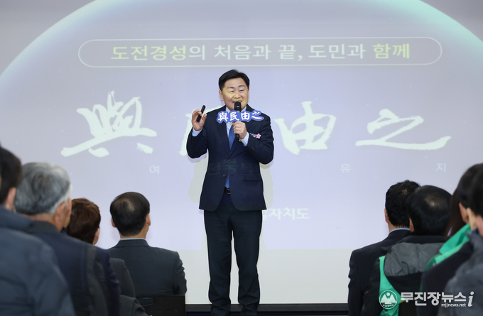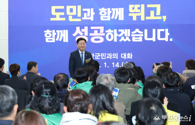 도는 14일 오전 진안군청 강당에서 ‘도민과 함께하는 2026년 시군 방문’ 행사를 열고, 진안군 발전을 위한 협력 방안을 논의했다. 이날 자리에서는 수질 관리 체계 고도화, 친환경 발전시설 건립, 지역 농산물 판로 개척, 도보 여행 인프라 구축 등 다양한 분야의 핵심 과제들이 테이블에 올랐다.