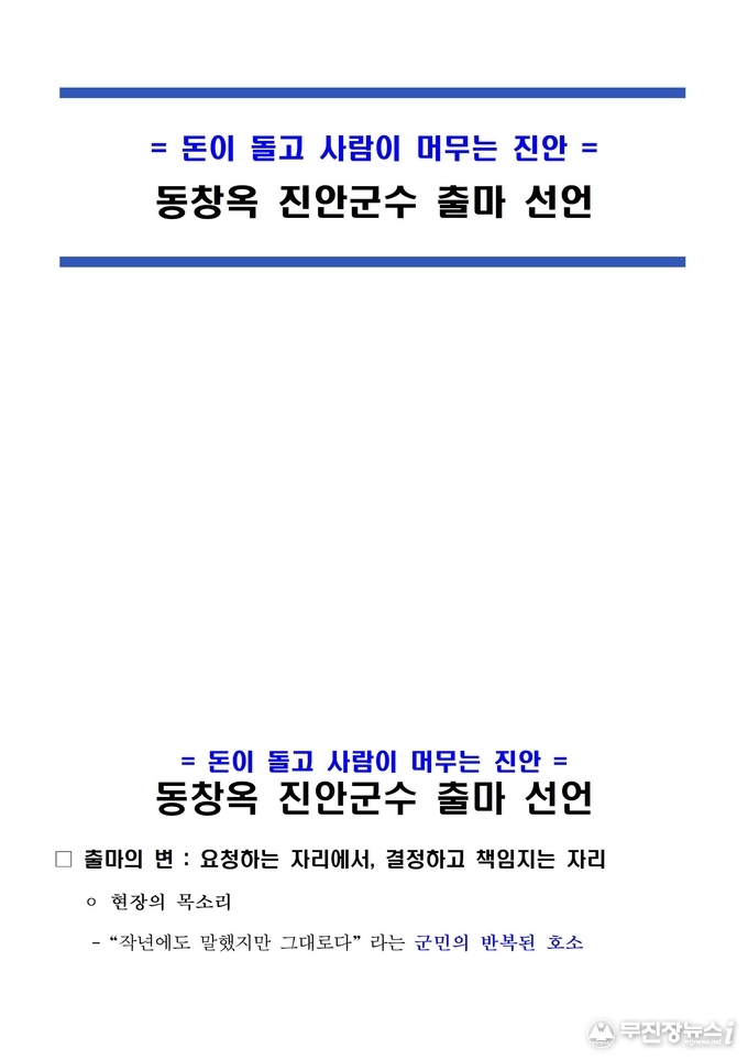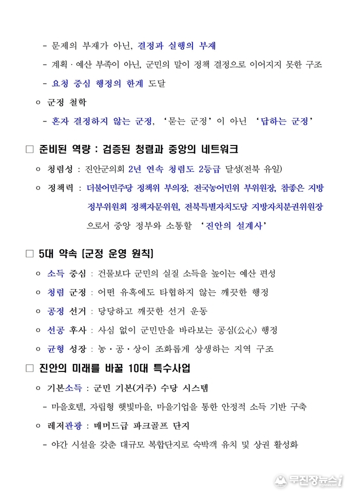 그는 “군수는 모든 것을 아는 사람이 아니라, 군민과 함께 결정하고 그 결과에 책임지는 사람이어야 한다”고 했다.