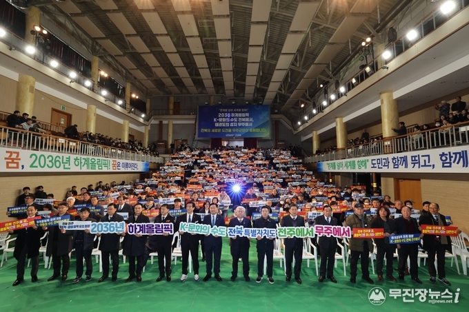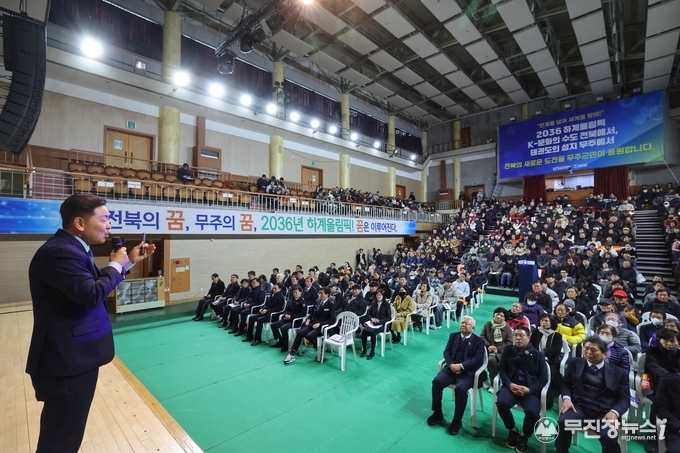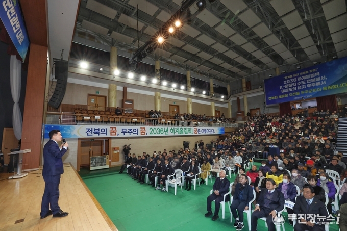 이어 무주예체문화관 다목적홀에서 진행된 행사에는 황인홍 무주군수와 오광석 무주군의회 의장, 윤정훈 도의원을 비롯한 무주군민 4백여 명이 참석해 ‘2036 하계올림픽 유치 기원’ 행사에 함께하며 도약을 위한 공생을 다짐했다.