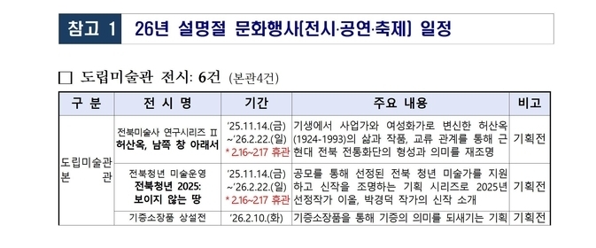 시군에서도 설 연휴를 맞아 전시와 공연이 이어져 전주 팔복예술공장 「사라지는 순간, 남겨진 형상」전과 전주대사습청 설 브랜드 공연, 익산 백제왕궁박물관 세계유산 등재 10주년 기념전, 마한박물관 ‘홀로그램 헤리티지’ 특별전이 관람객을 맞는다. 정읍시립미술관 「버라이어티 베어–WINTER」, 남원 김병종미술관 「오상아」전, 군산 근대역사박물관 공연·체험 프로그램 등 20여 건의 문화행사가 연휴 기간 발길을 이끈다.