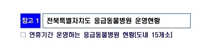 이와 함께 연휴 중 반려동물이 갑작스럽게 아프거나 사고를 당할 경우에 대비해 도내 응급 동물병원 15개소가 진료를 실시한다. 이 가운데 전주 지역 2개소는 24시간 운영돼 야간이나 심야에도 응급 진료를 받을 수 있다.