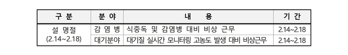 설 명절은 가족과 친지가 모이고 외부 활동이 늘어나는 시기로 식중독과 같은 감염병 발생 위험이 높아지고, 차량 이동 증가와 기상 여건 등으로 대기오염이 심화될 가능성도 있다.