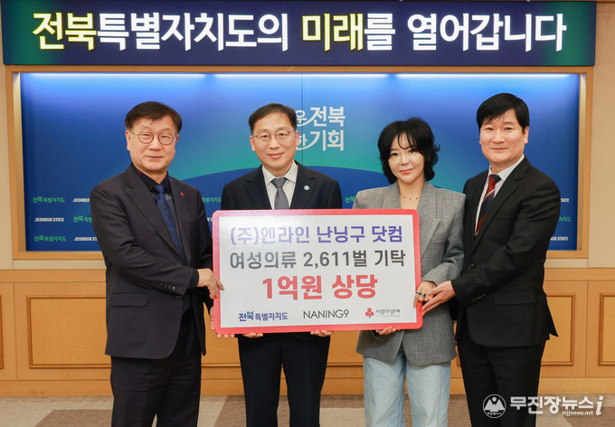 전북특별자치도는 20일 도청에서 ㈜엔라인이 운영하는 온라인 여성의류 쇼핑몰 ‘난닝구닷컴’의 의류 기탁식을 개최했다.