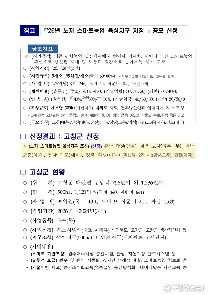 올해는 전국에서 5개 지역이 육성지구로 선정됐으며 전북에서는 고창군이 배추와 무를 중심으로 대상지에 포함됐다. 사업 대상지는 고창군 대산면 성남리 일원 약 500ha 규모로, 자동기상관측시스템과 관수·관비 자동화 시설 등 스마트농업 기반이 단계적으로 구축될 예정이다.