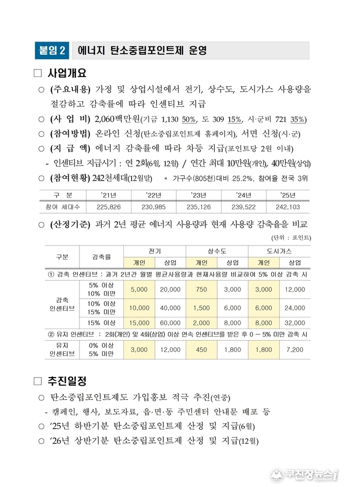 한편 도는 자동차뿐 아니라 전기·수도·도시가스 사용량을 줄이면 인센티브를 지급하는 ‘에너지 탄소중립포인트제’도 운영하고 있다. 별도의 모집기간 없이 탄소중립포인트제 누리집(cpoint.or.kr) 또는 시군을 통해 상시 신청할 수 있으며, 현재 도내 24만2천 세대가 참여하고 있다.