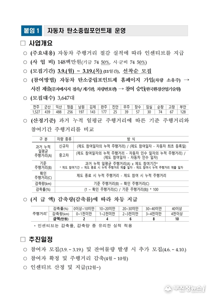 전북특별자치도가 자동차 주행거리를 줄여 온실가스를 감축하는 도민에게 인센티브를 지급하는 ‘자동차 탄소중립포인트제’ 참여자를 오는 3월 9일부터 19일까지 선착순 모집한다.