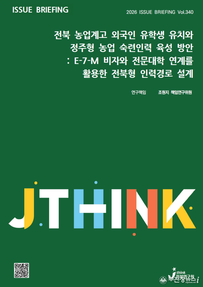 조원지 책임연구위원은 ‘전북이 선제적으로 농업계고 유학생-E-7-M-정주 모델을 설계해 정부에 제안한다면, 농업·농촌 인구위기 대응에서 전북형 선도 모델을 만들 수 있다’며, ‘이번 이슈브리핑을 계기로 농업 인력정책·농촌 인구정책·외국인 유학생 정책을 하나의 패스웨이 관점에서 통합적으로 논의하기를 바란다’고 말했다.