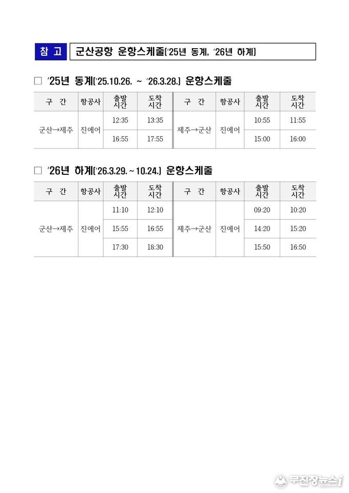 이번 증편은 국토교통부의 2026년 하계 정기 항공편 일정 확정에 따라 추진되는 것으로, 도민의 항공교통 편익을 높이고 군산공항 이용 활성화를 위한 조치다.