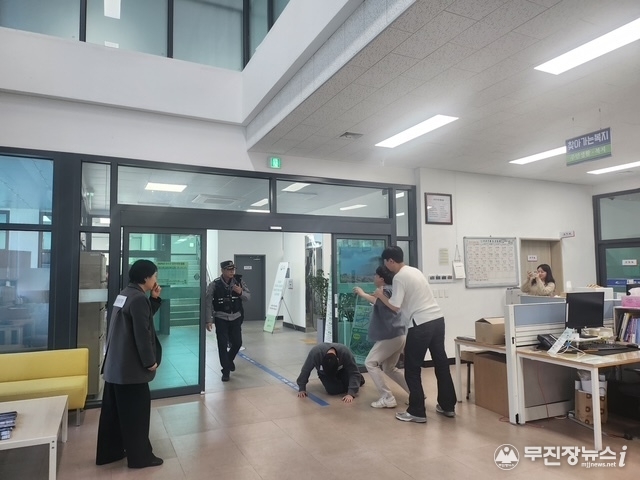 이번 모의훈련은 △민원인의 폭언 발생 시 상급자의 적극 개입과 진정 유도 △폭언 및 폭행 발생 시 사전 고지 후 촬영·녹음 △안심벨을 통한 경찰 호출 △피해 공무원 보호 및 방문 민원인 분리 대피 △민원인 제압 및 출동 경찰 인계 등 단계별 대응 절차를 중심으로 실시됐다.