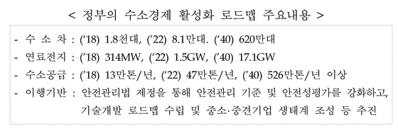정부는 ’수소차‘와 ’연료전지‘를 양대축으로 수소산업을 선도할 산업생태계 조성하고 있으며 경제적이고 안정적인 수소 공급체계 구축 및 안전기준, 관련법안 등을 마련하고 있다.