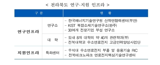 전북은 전국 시도 가운데 가장 먼저 신재생에너지산업을 전략산업으로 선정하고 관련 인프라 구축 및 산업육성을 위해 노력해왔으며, 세계적 기업 등이 위치하고 있어 수소산업을 선도할 우수한 여건을 보유하고 있다.