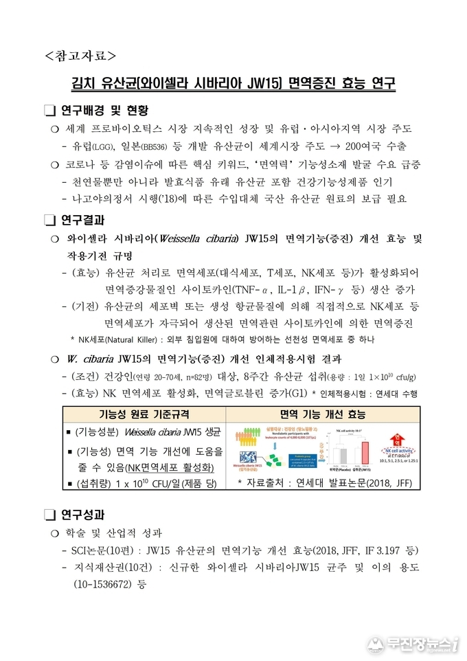 농촌진흥청은 충북대학교, 연세대학교와 함께 동물시험, 인체적용시험을 통해 김치 유래 유산균 ‘와이셀라 시바리아 JW15 (Weissella cibaria JW15)’의 면역기능 개선 효과를 밝혔다.