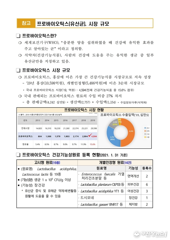 국내 건강기능식품 시장에서 프로바이오틱스는 2017년 9.7%에서 2019년 15.6% 점유율을 보이며 급성장해 홍삼, 개별인정형 원료 다음으로 큰 시장을 형성하고 있다.