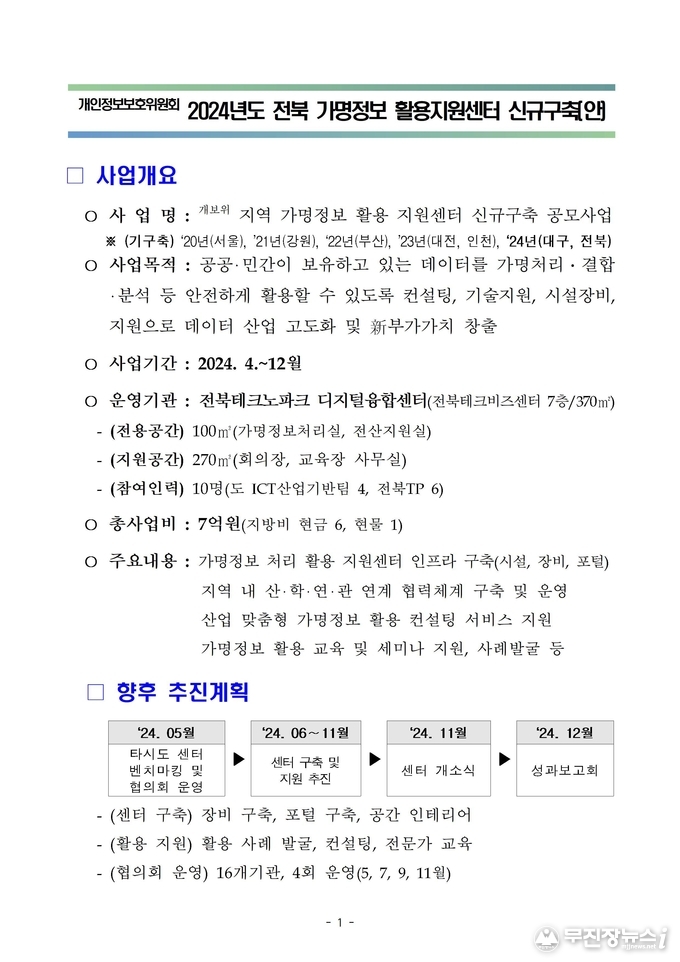 전북자치도는 자체예산 6억원을 투입해 전북테크노파크 디지털융합센터에 지원센터를 구축·운영할 계획이다. 이를 통해 가명정보 활용 역량이나 기반시설이 필요한 중소기업, 공공기관 등에게 가명정보 처리․결합․활용을 위한 시설, 컨설팅, 교육 등 전반을 지원할 계획이다.