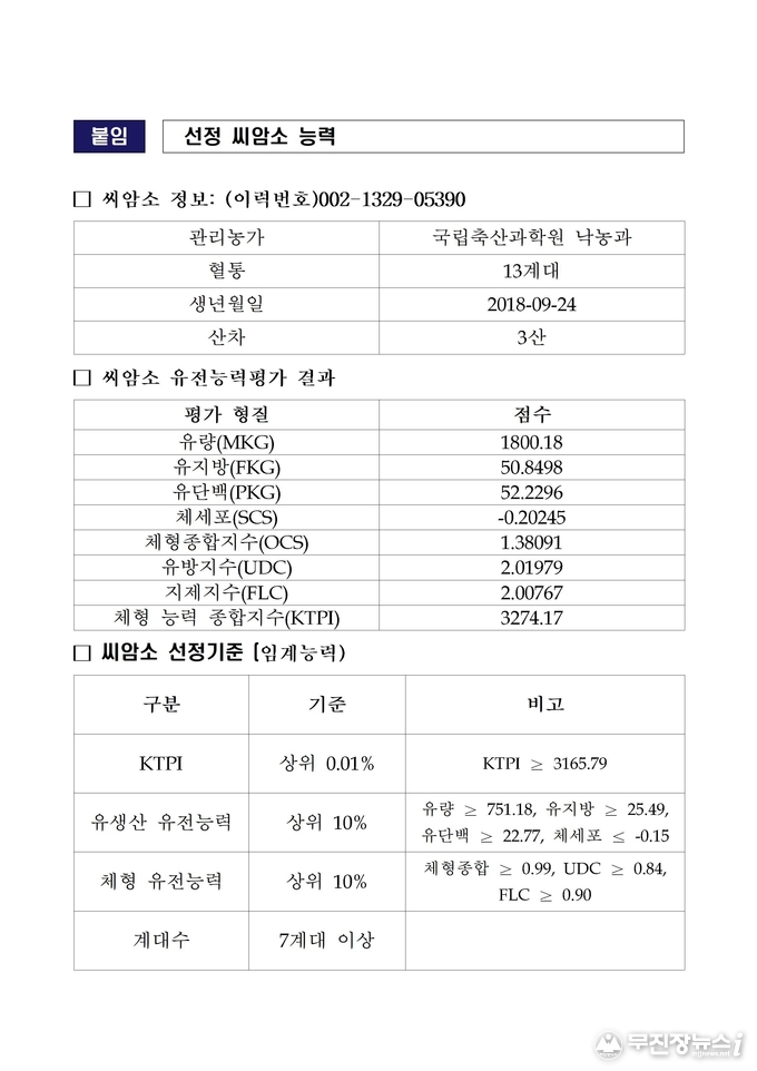 선발 씨암소 혈통은 13계대이며, 한국형 생산 체형 능력 종합지수(KTPI)는 상위 5%다. 모든 형질이 상위 10% 안에 들고, 특히 우유 생산량 형질은 최상위를 기록했다.