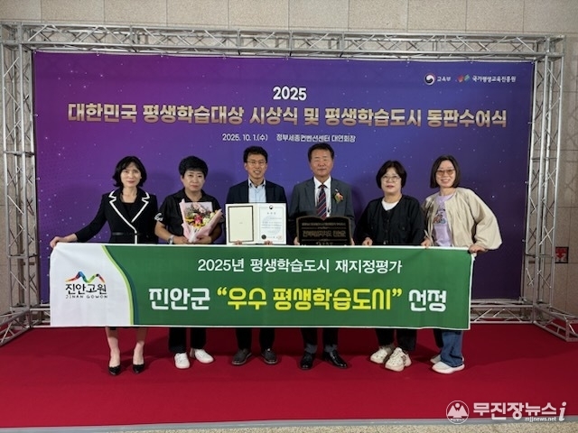 진안군(군수 전춘성)이 교육부가 주최한 2025년 평생학습도시 재지정평가에서 ‘우수 평생학습도시’로 선정되며, 1일 세종컨벤션센터에서 열린‘대한민국 평생학습대상’에서 부총리 표창을 수상했다.