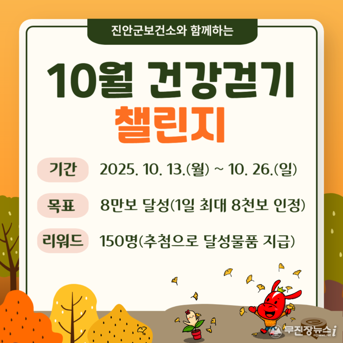 진안군은 오는 10월 13일부터 26일까지 2주간 모바일 걷기 앱 워크온을 활용한 10월 건강걷기 챌린지를 운영한다.