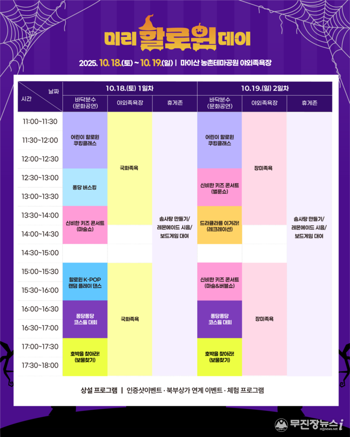 마이산 북부 야외족욕장에서는 매월 새로운 주제로 다양한 이벤트를 선보이고 있으며 이번 10월 특별 행사는 할로윈 데이를 주제로 △할로윈 코스튬 대회 △어린이 쿠킹클래스 △신비한 키즈 콘서트(마술&버블쇼) △할로윈 타로체험 등 다채로운 프로그램이 마련된다. 행사는 양일간 오전 11시부터 오후 6시까지 진행되며 일부 행사는 SNS 등을 활용해 사전 신청을 받아 운영된다.