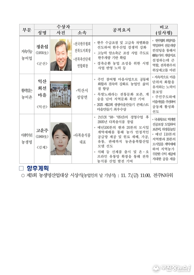 이번 대상은 ▲지속가능 농어업 ▲활력있는 농어촌 ▲미래먹거리 농생명 등 3개 부문에서 각 1명(단체)을 선정했다. 도는 지난 7월 16일부터 9월 5일까지 52일간 시‧군을 통해 후보자를 추천받아 현지조사와 심사를 진행했으며, 현지조사 통과자 11명을 대상으로 10월 13일 열린 심사위원회에서 최종 수상자를 확정했다. 시상식은 오는 11월 7일 ‘전북농업인의 날’기념식에서 상패와 메달이 수여될 예정이다.