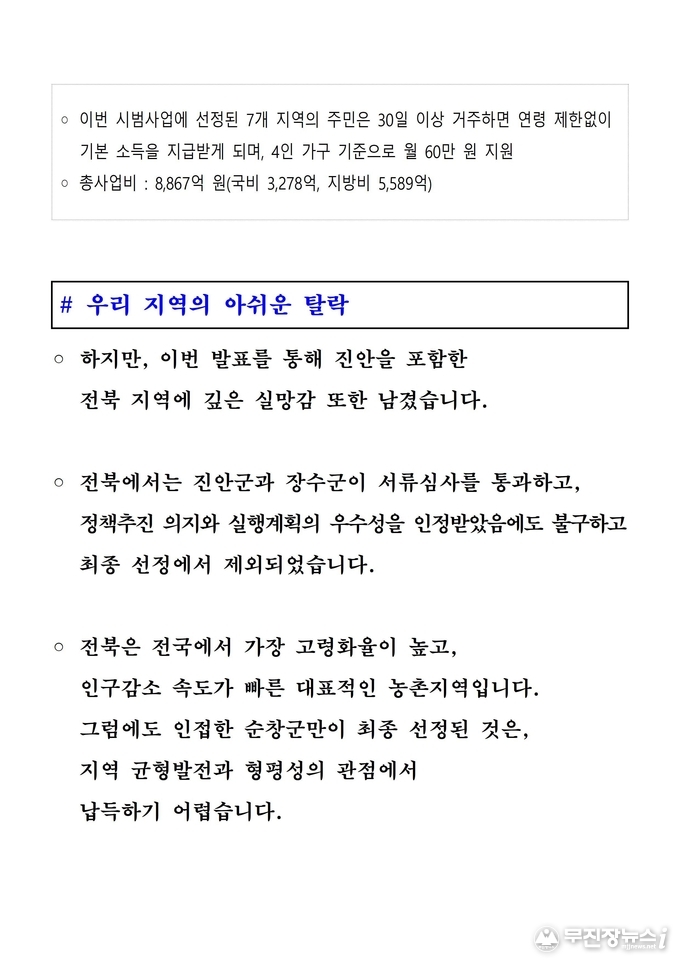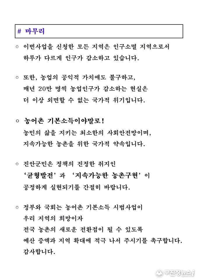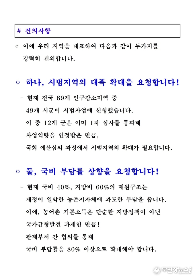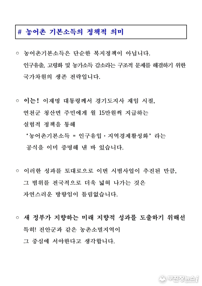 또한 “현재 국비 40%, 지방비 60%의 재원 구조는 재정이 열악한 농촌 지자체에 과도한 부담으로 작용하고 있다”며 “국비 부담률을 최소 80% 수준으로 상향 조정해야 농어촌 기본소득이 실질적으로 추진될 수 있다”고 주장했다.