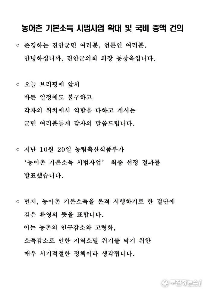 진안군의회(의장 동창옥)는 지난 22일 진안군청 브리핑실에서 정부가 발표한 농어촌 기본소득 시범사업에 대한 환영의 뜻을 밝히며, 향후 시범지역의 대폭 확대와 국비 부담률 상향을 강력히 건의했다.