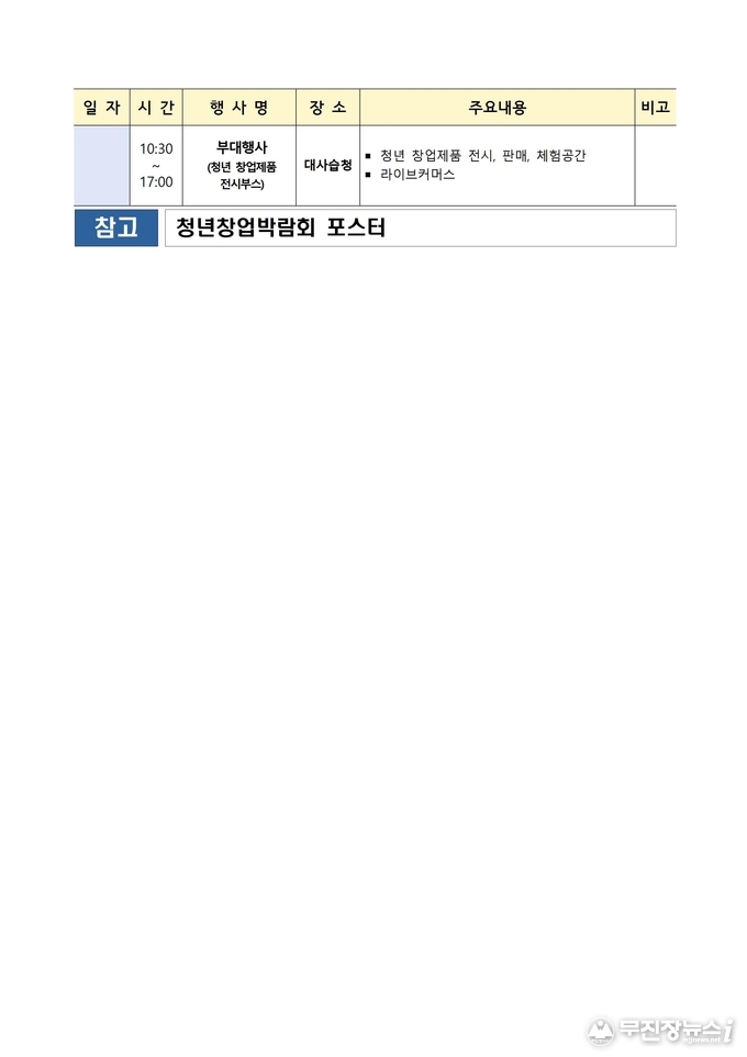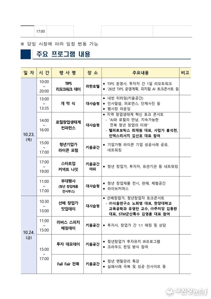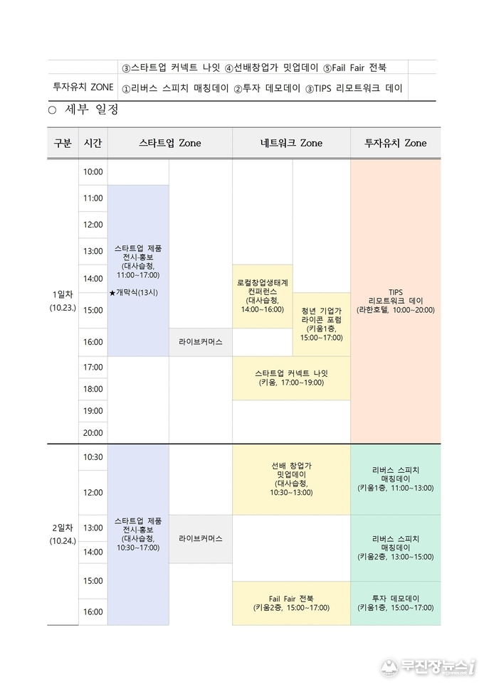 둘째 날은 ㈜식음연구소 노희영 대표, 한양대 유영만 교수, ㈜주미당 김동완 대표, STM군산특수 김영훈 대표가 함께하는 ‘선배창업가 밋업데이’가 열릴 예정으로, 실패 극복과 도전의 노하우를 나누는 자리가 마련된다.