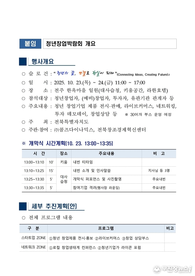 전북자치도가 주최하고 ㈜콜즈다이나믹스와 전북창조경제혁신센터가 공동 주관한 이번 행사는 '청년의 꿈, 연결로 현실이 되다(Connecting Ideas, Creating Future)'라는 슬로건 아래 청년 창업기업의 성장과 교류를 지원하고, 지역 창업 생태계 활성화를 위해 마련됐다.