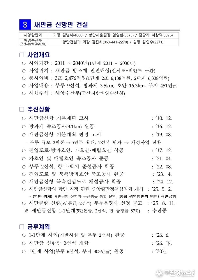 새만금 신항만은 2040년까지 총 3조 2,476억 원을 들여 9선석과 451만㎡ 배후부지를 갖춘 대규모 항만으로 조성된다. 현재 1-1단계(5만 톤급 2선석) 공사는 88% 진행됐으며, 2026년 하반기 개항을 앞두고 있다.