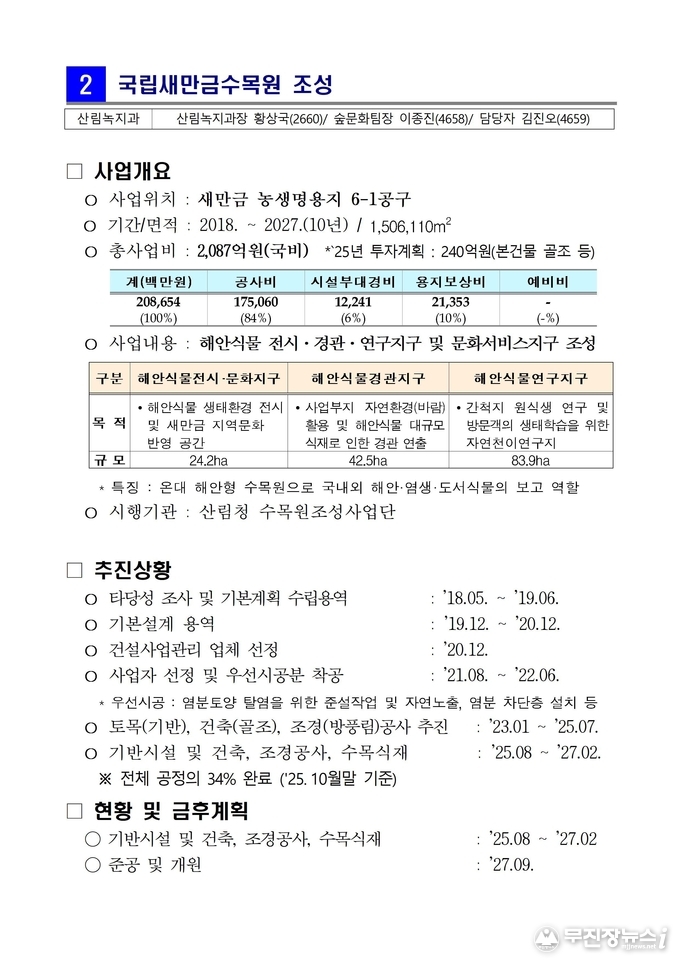 새만금 농생명용지에 조성 중인 국립새만금수목원(총면적 151ha, 사업비 2,087억 원)은 2027년 2월 준공을 목표로 공사가 한창이다. 국내 최초 해안형 수목원으로서 간척지 생태복원과 해안식물 연구의 중심지 역할을 맡는다.