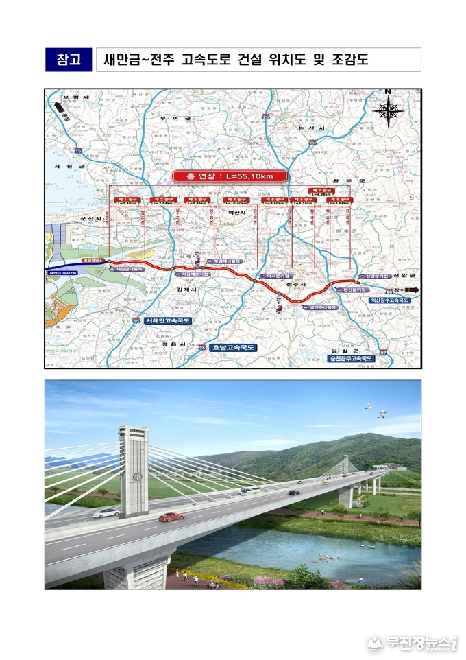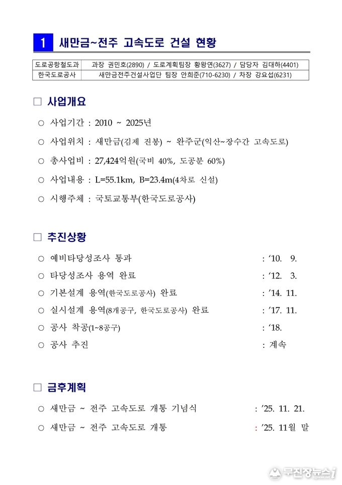 24일 전북자치도에 따르면, 김제 진봉에서 완주를 잇는 새만금~전주 고속도로(총연장 55.1km)가 오는 11월 21일 개통식을 시작으로 11월 말 개통될 예정이다. 2010년 착공 이후 15년 만이다. 총사업비 2조 7,424억 원이 투입된 이 도로는 완주에서 새만금까지 기존 76분에서 33분으로 단축시켜 43분이나 줄어든다.