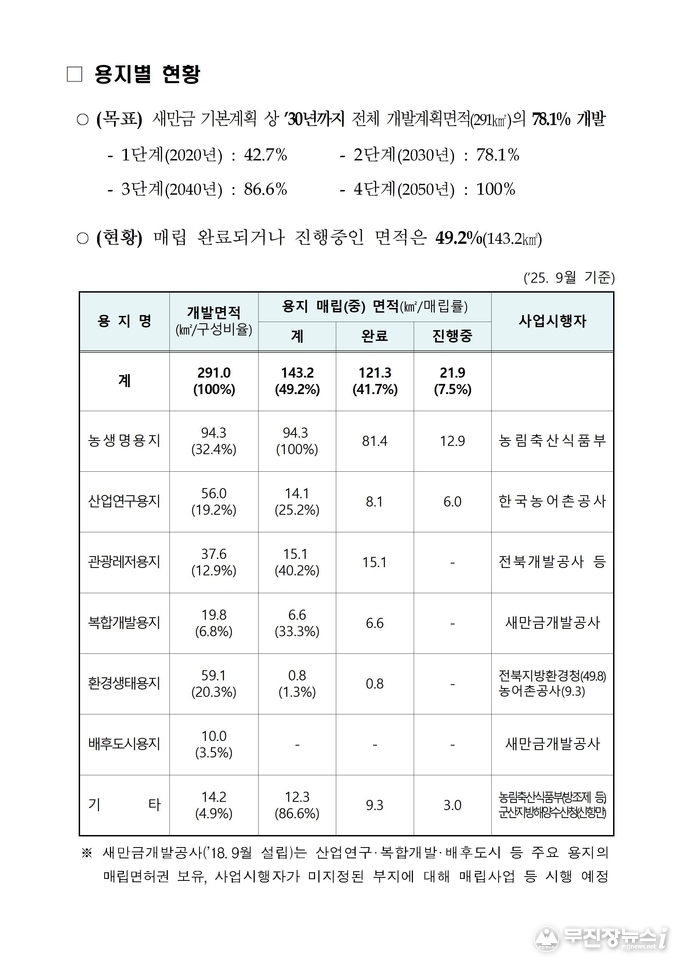 김관영 전북자치도지사는 “새만금은 단순한 개발사업이 아니라 전북의 산업 지도를 바꾸는 국가 프로젝트”라며 “고속도로, 항만, 수목원, 관광을 유기적으로 연결하고, 새만금 RE100 산단 지정과 글로벌 메가샌드박스 구축 등을 통해 전북의 미래 100년을 열어가겠다”고 말했다.
