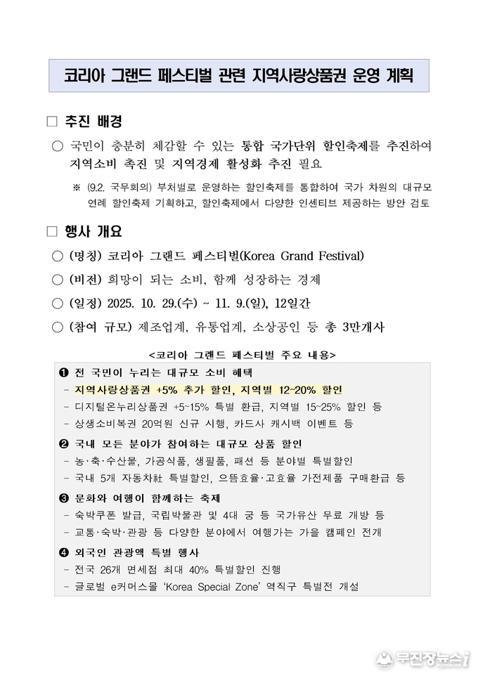 전북특별자치도는 2025년 10월 29일부터 11월 9일까지 12일간 열리는 ‘코리아 그랜드 페스티벌(Korea Grand Festival)’ 기간 동안, 도내 14개 시·군에서 지역사랑상품권 최대 20% 특별 할인 혜택을 한시적으로 제공한다고 밝혔다.