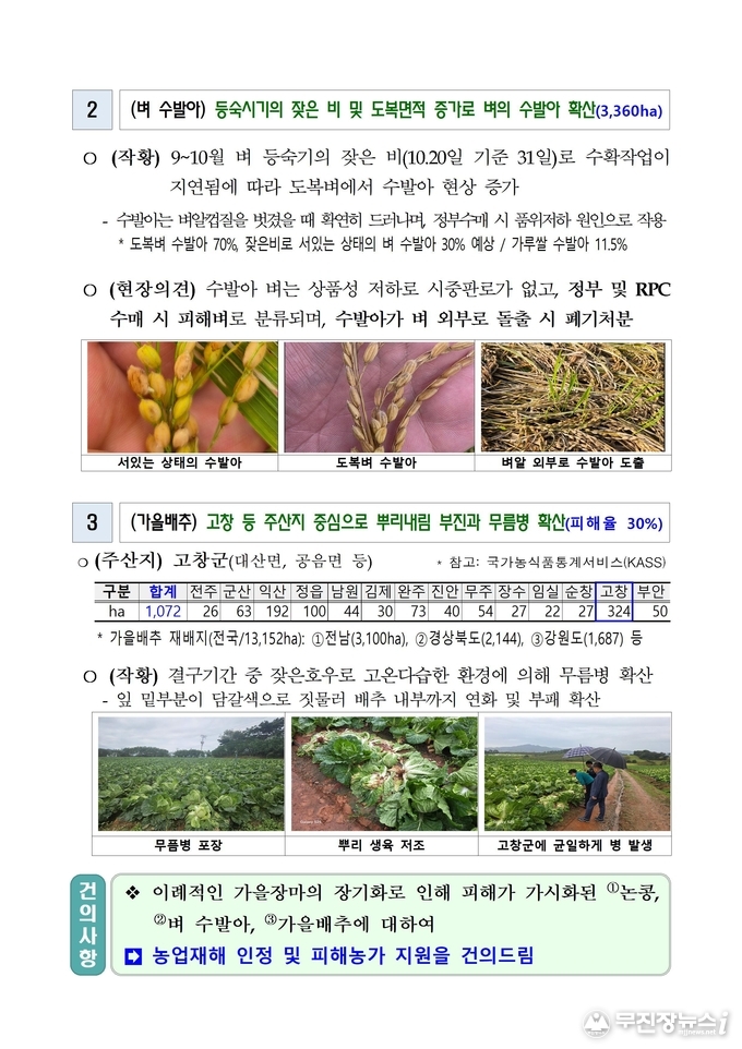 앞서 가을배추 및 논콩 피해도 지난 10월 23일 농업재해로 인정된 바 있다. 현장조사에서 가을배추는 익산·정읍·고창 등에서 322ha(잠정) 규모로 뿌리내림 부진과 무름병이 발생했고, 논콩은 익산·정읍·김제·부안 등 5,420ha(잠정)에 달하는 잎과 줄기 마름, 뿌리썩음 증상을 확인했다.