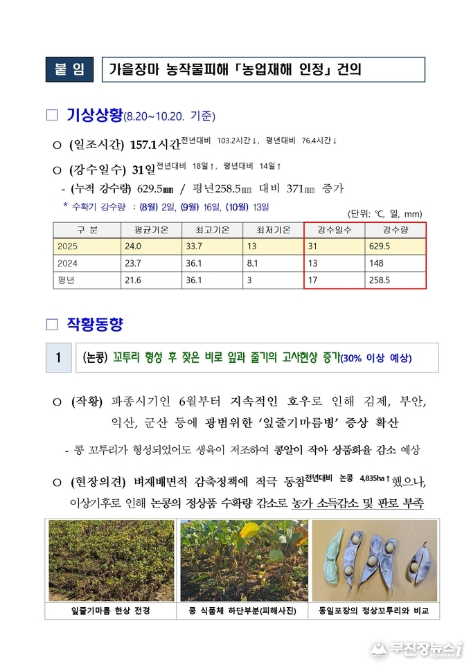 도는 올해 8월 말부터 10월까지 계속된 잦은 비로 농작물 피해가 예상되자 주산지를 중심으로 현장조사에 나섰다. 김관영 지사는 논콩과 벼 수발아 피해 현장을 직접 방문해 농민들의 애로사항을 청취하고 작물 피해 상황을 확인한 뒤, 농림축산식품부에 신속한 대책 마련과 농업재해 인정을 건의했다.